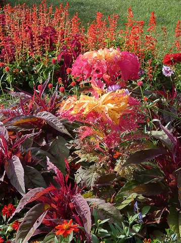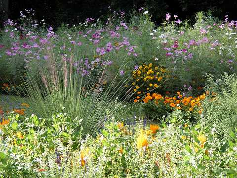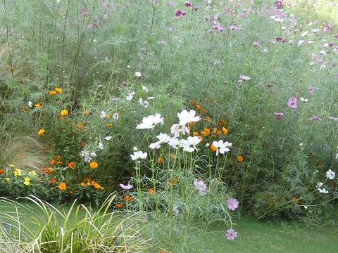 | ケイトウ、サルビア、キバナコスモス、ジニア、コスモス、スティパ |