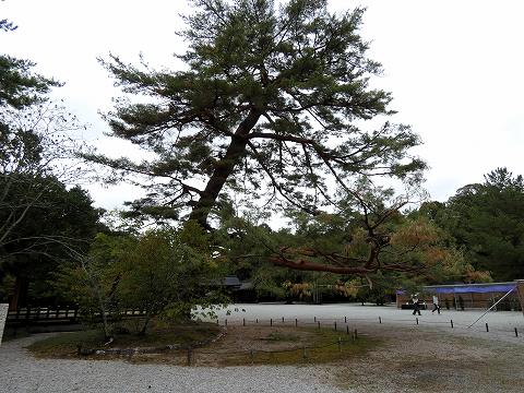 境内の曲がった赤松の樹とその後ろに見える北神門