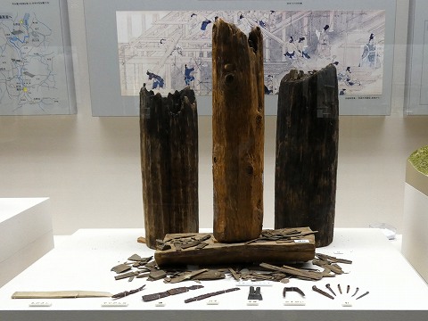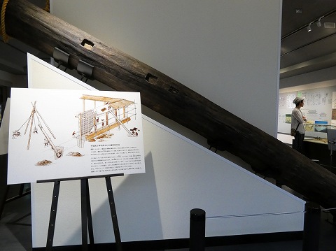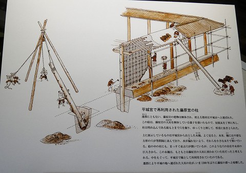 藤原宮の建物の柱などの建材は平城宮へ運ばれ、新たに加工を施し再利用されていました。平城宮跡から発掘されたそのような柱が、今回藤原京復現のために再び藤原京跡地へ持ち込まれ里帰りを果たしました。 |