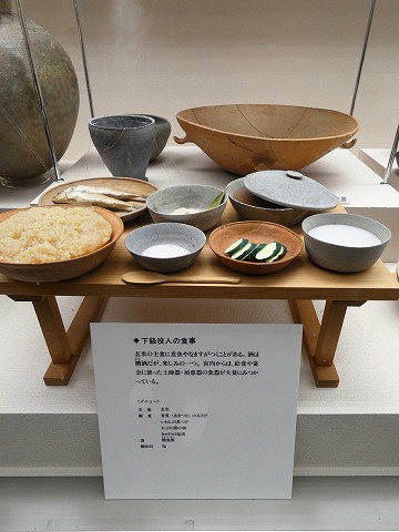 | 玄米の主食に煮魚やなますが付くことがある。酒はかす酒だが、楽しみの一つ。宮内からは、給食や宴会に使った土師器・須恵器の食器が 大量に見つかっている。 |