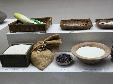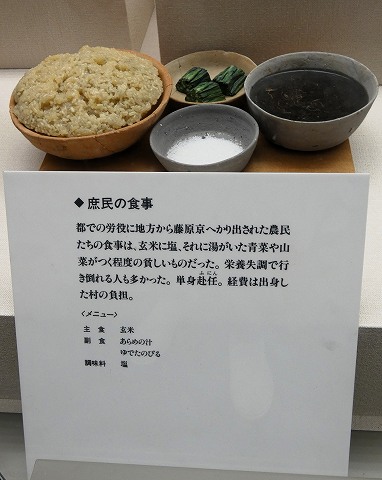 | 都での労役に地方から藤原京へかり出された農民達の食事は、玄米に塩、それに湯がいた青菜や山菜がつく程度の貧しいものだった。栄養失調で行き倒れる人も多かった。単身赴任で経費は送り出した村の負担。 |