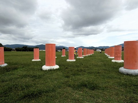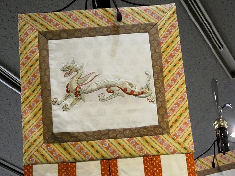 写真中央に烏(からす)をかたどった銅製の幢が、その左右に日像(太陽)と月像の幢が、さらにそれらを囲む四隅には朱雀・青龍・白虎・玄武の四神旗が立てられました。残念ながらこの写真では青龍、玄武の幢幡は各々朱雀・白虎の背後に立っているため見ることができません。下の写真を参考に