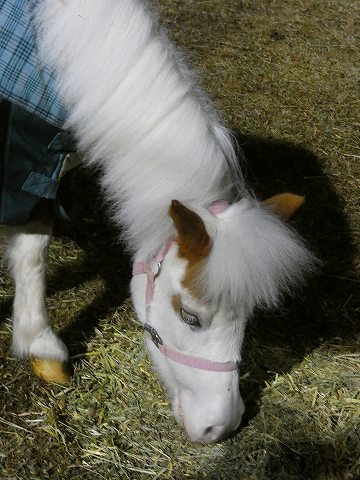 朝ごはんを食べる→お部屋の掃除をしてもらう→お散歩→放牧→ブラッシングやシャンプー→夕方のご飯を食べる→夜食の乾草(ほしくさ)をもらう→好きな時間に寝る。