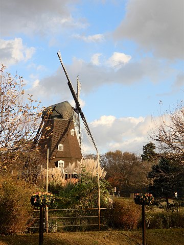 | デンマーク・オーデンセ市のフュン野外博物館に現存する1800年代に建設された風車を手本に、デンマークの職人によって組み立てられた粉ひき風車。本体の高さ16.4m、1枚の羽の長さ約11.3m。風車1階には風車について学べる展示スペースもあります。平成23年12月には「船橋市景観重要建造物」に指定されました。 |